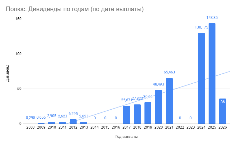 Хороший пример того, как дивиденды раскрываются на длинной дистанции — история выплат Полюс (рис 1). Были паузы в выплатах, но в целом, за 15 лет (с 2010 по 2025) дивиденды выросли почти в 50 раз.