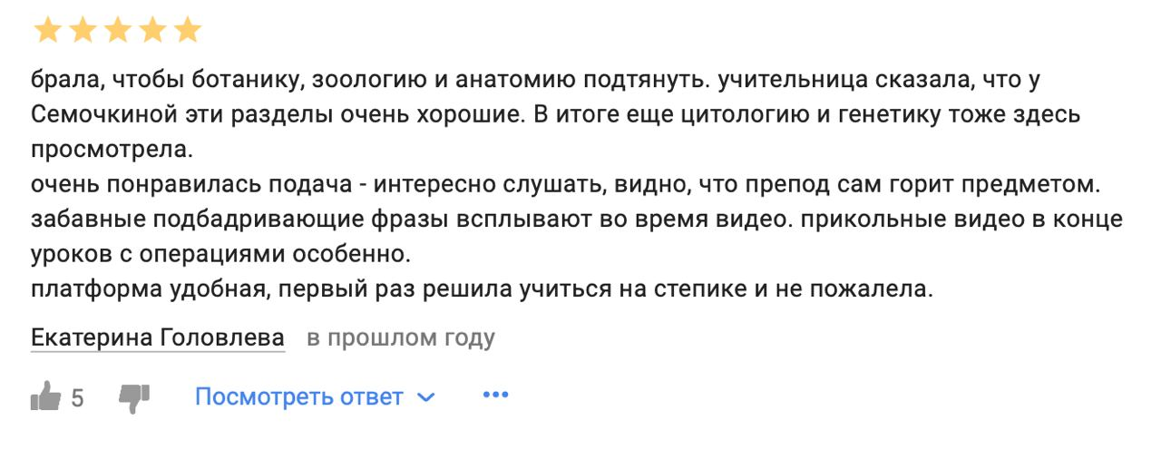 Брала, чтобы ботанику, зоологию и анатомию подтянуть. учительница сказала, что у Семочкиной эти разделы очень хорошие. В итоге еще цитологию и генетику тоже здесь просмотрела. очень понравилась подача — интересно слушать, видно, что препод сам горит предметом. забавные подбадривающие фразы всплывают во время видео. прикольные видео в конце уроков с операциями особенно. платформа удобная, первый раз решила учиться на степике и не пожалела. брала, чтобы ботанику, зоологию и анатомию подтянуть. учительница сказала, что у Семочкиной эти разделы очень хорошие. В итоге еще цитологию и генетику тоже здесь просмотрела. очень понравилась подача — интересно слушать, видно, что препод сам горит предметом. забавные подбадривающие фразы всплывают во время видео. прикольные видео в конце уроков с операциями особенно. платформа удобная, первый раз решила учиться на степике и не пожалела.